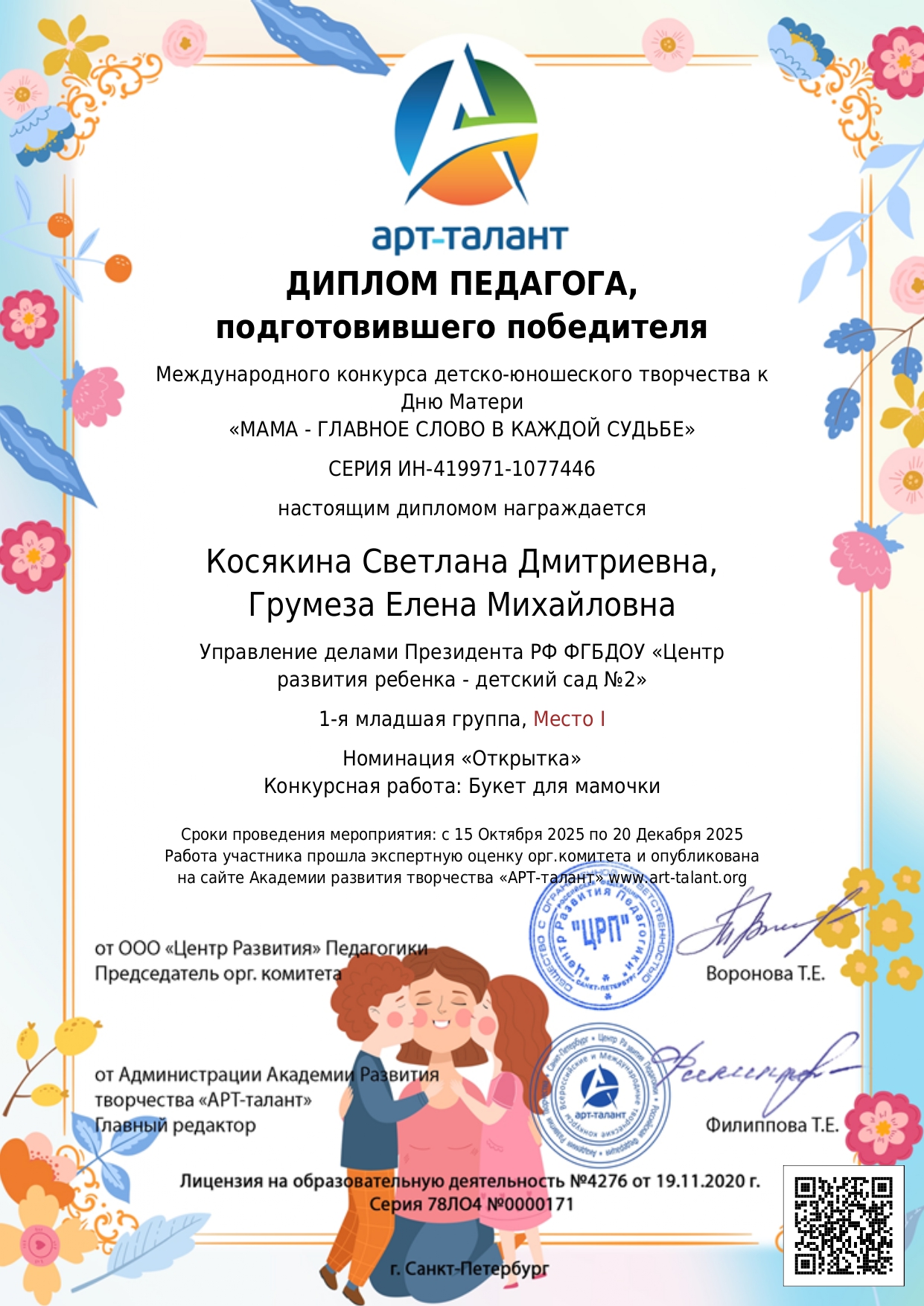 Международный конкурс Детско-юношеского творчества к Дню Матери "Мама-главное слово в каждой судьбе". Номинация "Открытка" Конкурсная работа: Букет для мамочки.