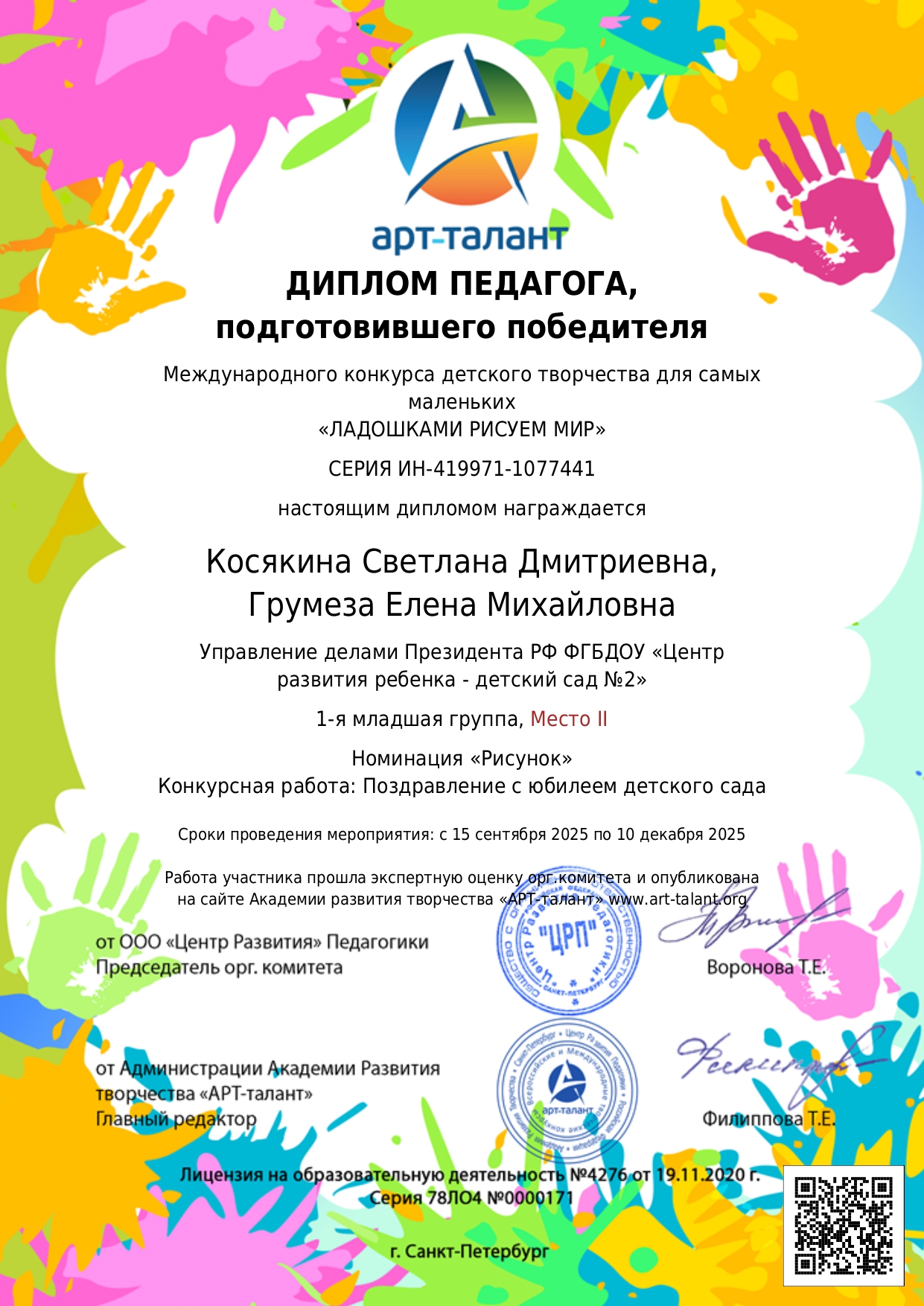 Международный конкурс детского творчества для самых маленьких "Ладошками рисуем мир". Номинация "Рисунок" Конкурсная работа: Поздравление с юбилеем детского сада.